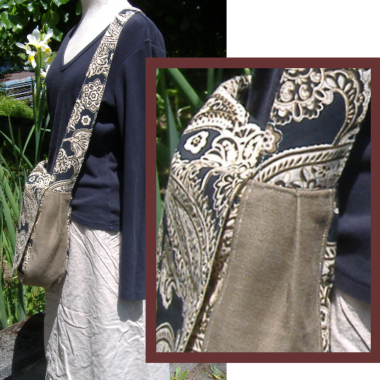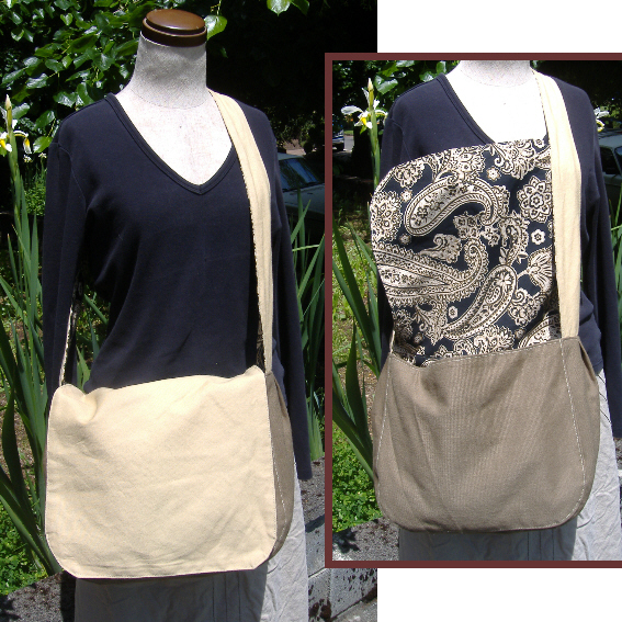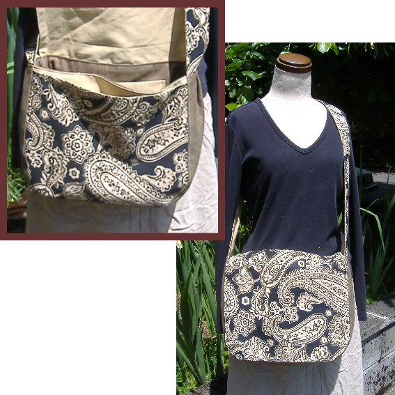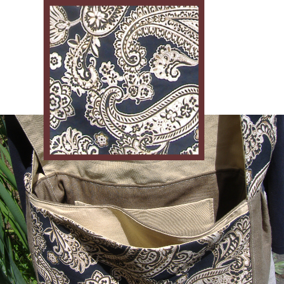 This great bag is one of a series made out of some awesome cotton canvas prints I picked up from the fabric store. The durability of the thick and tight thread count was sold as a home dec fabric, but it's perfect for tote or messenger bags as well. I used some more solid canvas and twill to complete the bags and as a result, these are totally reversible and lovingly crafted :)