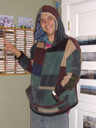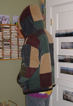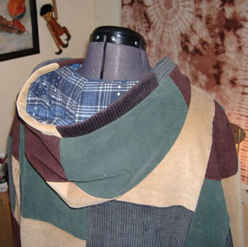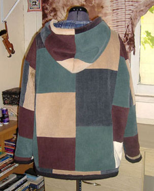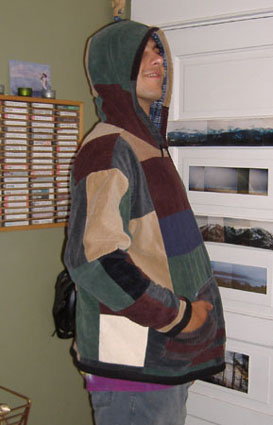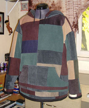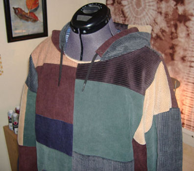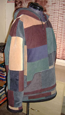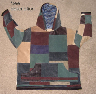 I am so glad to have this hoodie up online! :) The outside of this one is all corduroy, mostly recycled... the fabrics are mainly a wide-wale gray, a burgandy with a black herringbone design, a grassy green, and lots of beige and tan... there's also some brown and blue thrown in there too! All the seams are double-stiched for longevity, The entire piece is *fully lined* with soft and warm fabric. The waist opening and sleeve openings are binded with thick, black fleece. The hood has a *drawstring pull* for when it gets too windy, and also a large roo-pocket in the front. The fitting is best for guys about 5'8" or less, with small to medium builds, and for medium framed mamas.